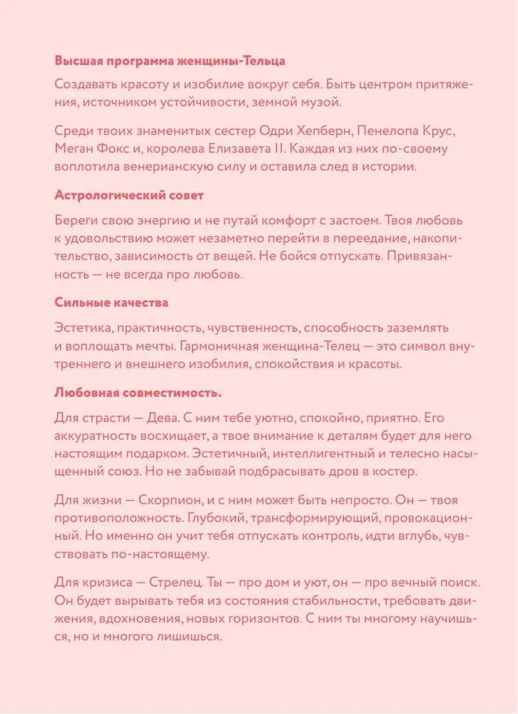 Уже с весны ты почувствуешь, что пора избавляться от лишнего – в вещах, делах и людях. Меньше суеты, больше глубины. Твои финансовые вопросы решатся через новые источники дохода, а личная жизнь обретёт устойчивость. 2026 год, словно мягкий диван, подарит чувство опоры и понимание того, что ты на своем месте. И пусть весь мир подождет… В этом ежедневнике: миссия Тельцов и их сильные стороны, любовная совместимость с другими знаками Зодиака, подробный гороскоп: на весь год, 12 месяцев и каждую неделю, лунный календарь.