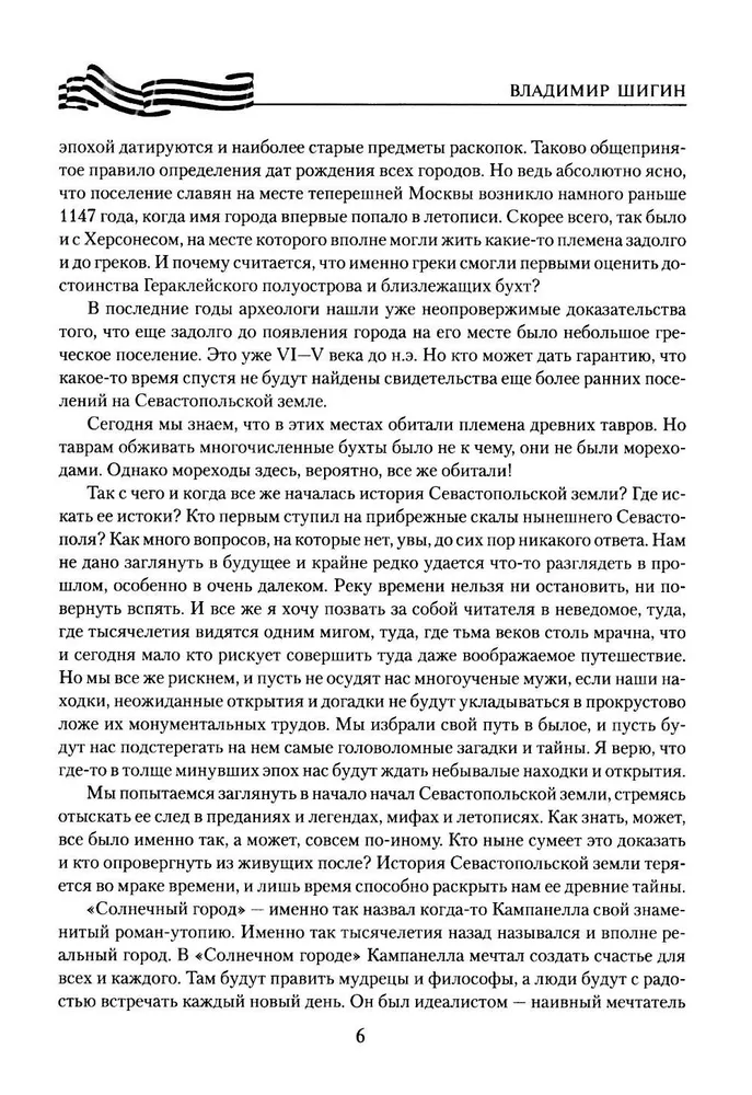 За многие столетия, что существует Севастополь, над ним пронеслось немало страшных бурь. Враги часто разрушали Севастополь, но он всякий раз возрождался. На смену одним жителям приходили другие. Различными были их происхождение и язык, верования и культура. Одно лишь оставалось неизменным и общим — земля, на которой они жили. Земля мореплавателей и богатырей, героев и великомучеников. Земля, опаленная солнцем и омытая кровью. Сколько неразгаданных тайн хранит она…