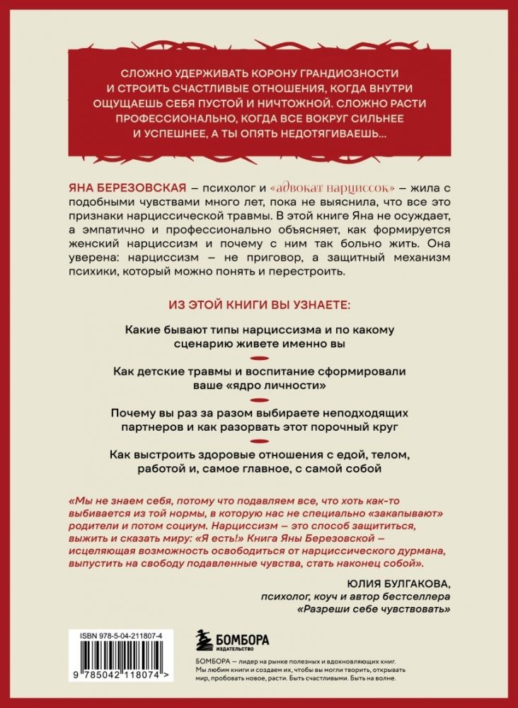 Сложно удерживать корону грандиозности и строить счастливые отношения, когда внутри ощущаешь себя пустой и ничтожной. Сложно расти профессионально, когда все вокруг сильнее и успешнее, а ты опять не дотягиваешь… Яна Березовская – психолог и "адвокат нарциссок" жила с подобными чувствами много лет, пока не выяснила, что все это признаки нарциссической травмы. В этой книге Яна не осуждает, а эмпатично и профессионально объясняет, как формируется женский нарциссизм и почему с ним так больно жить. Она уверена: нарциссизм – не приговор, а защитный механизм психики, который можно понять и перестроить.