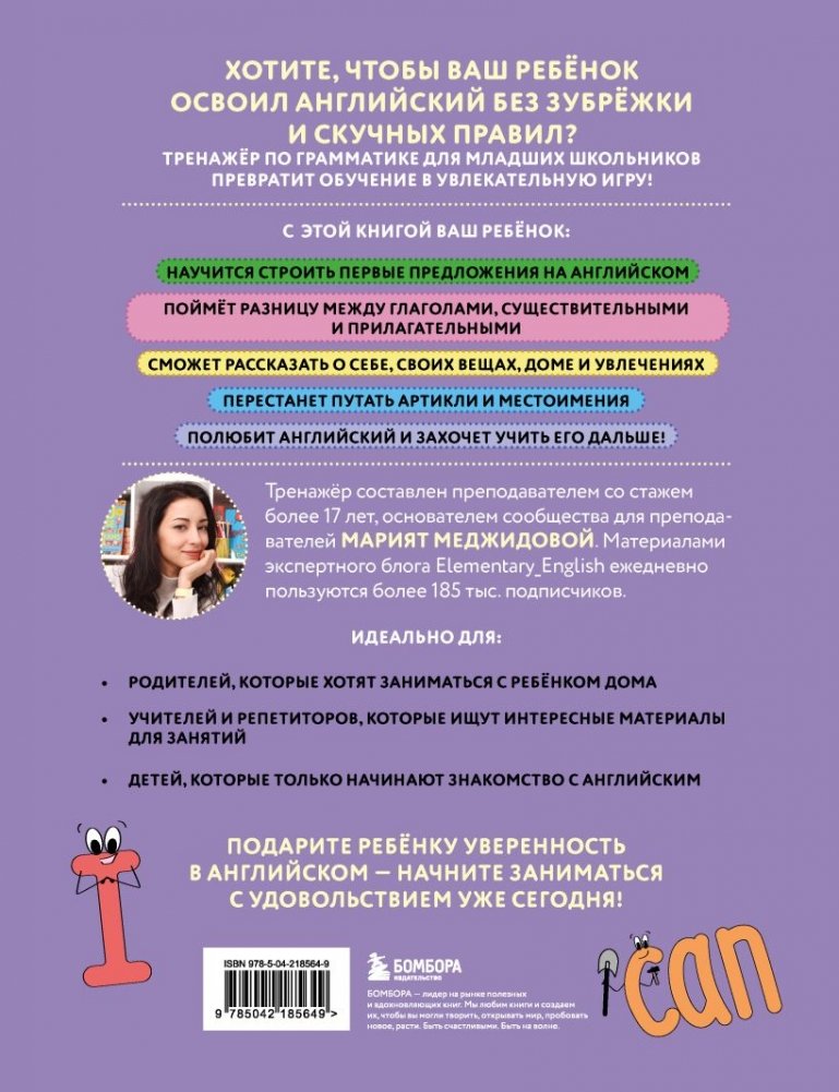 Грамматика английского языка может быть простой, увлекательной и понятной — без зубрежки и скучной теории. С этим тренажёром вы сможете помочь ребенку легко освоить правила, познакомиться с артиклями, частями речи и превратить занятия в настоящую игру. В построении первых предложений на английском помогут авторские карточки, игровые задания и яркие иллюстрации. Методику преподавателя с многолетним опытом Марият Меджидовой уже используют и практикуют более 185 тысяч подписчиков ее экспертного блога Elementary_English. На протяжении всей книги размещены подсказки для родителей, а в конце — удобный словарик по урокам и ответы к заданиям. Занимайтесь с удовольствием вместе с ребенком!