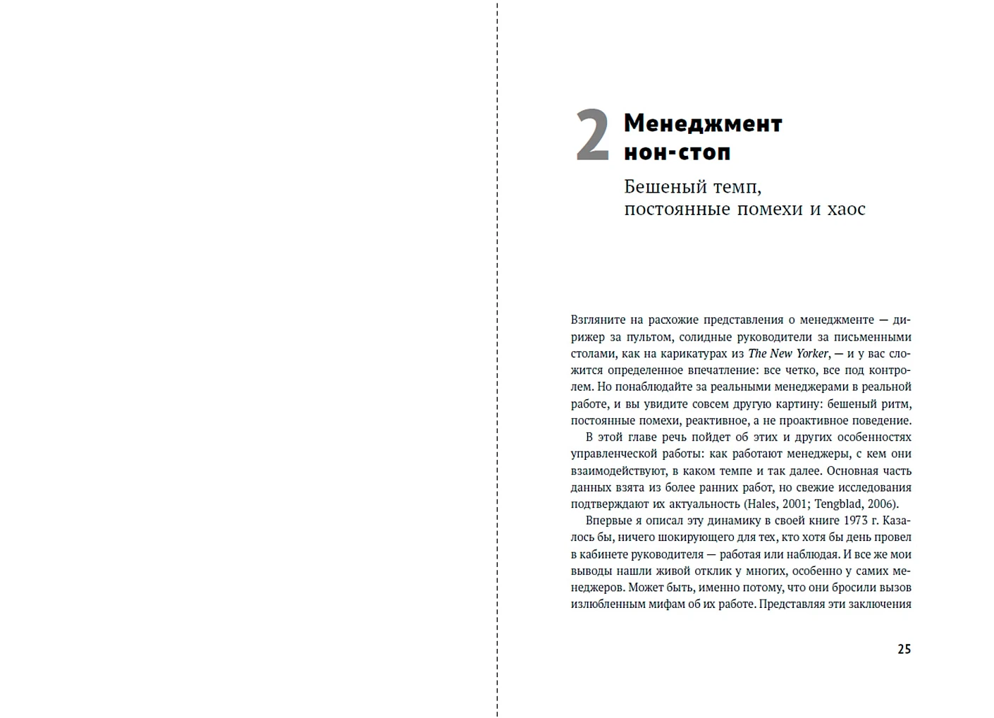 На основании исследования реальной работы руководителей из самых разных отраслей он доказывает, что эффективное лидерство неотделимо от повседневной управленческой работы, а попытка быть «чистым» лидером, оторванным от рутины, — один из главных мифов, который мешает добиваться реальных результатов. Минцберг описывает реальный мир управления: бешеный темп, постоянные помехи и переключения, хаос, противоречивость и фрагментарность задач.