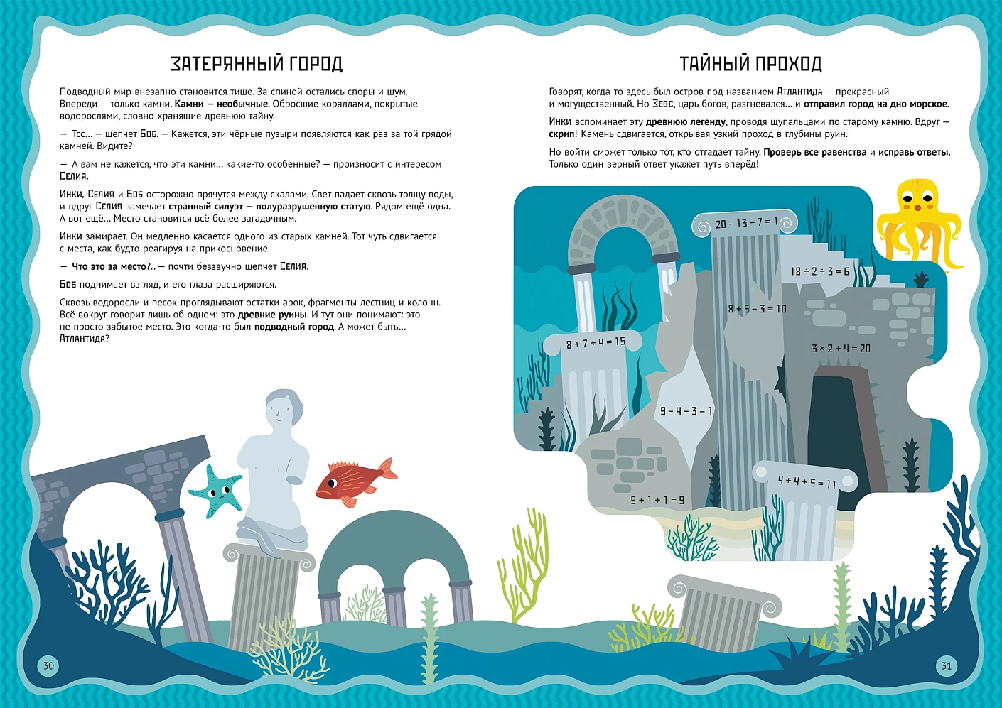 Книга построена как подводное приключение, в котором ребёнок вместе с героями — осьминогом Инки, морской звездой Селией и окунём Бобом — отправляется в загадочный Океан Вычислений. Каждая глава — это новая история и новая математическая задача: нужно зарядиться энергией чисел, разгадать тайну икринок, пройти через коралловый лабиринт, починить разрушенный риф, обхитрить кальмаров и даже победить в математическом турнире.