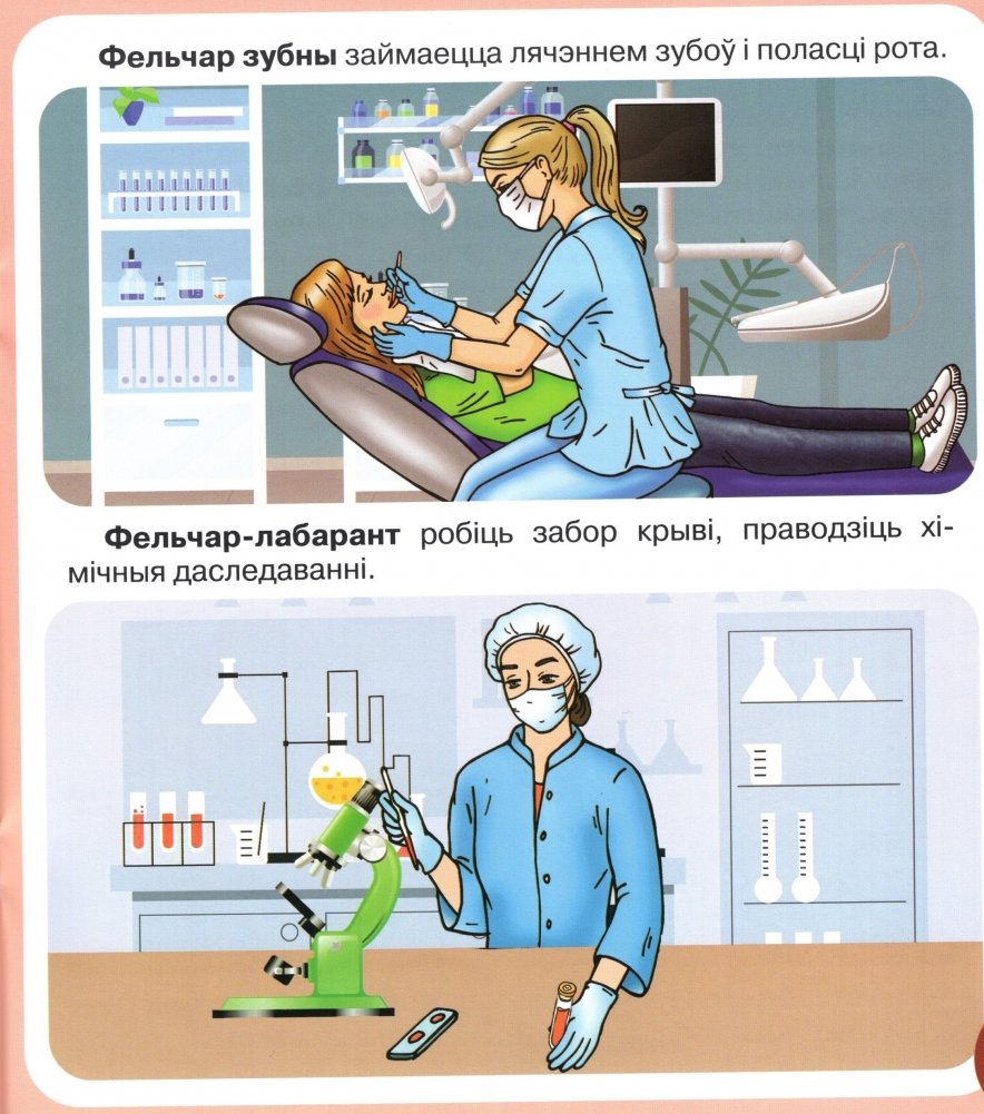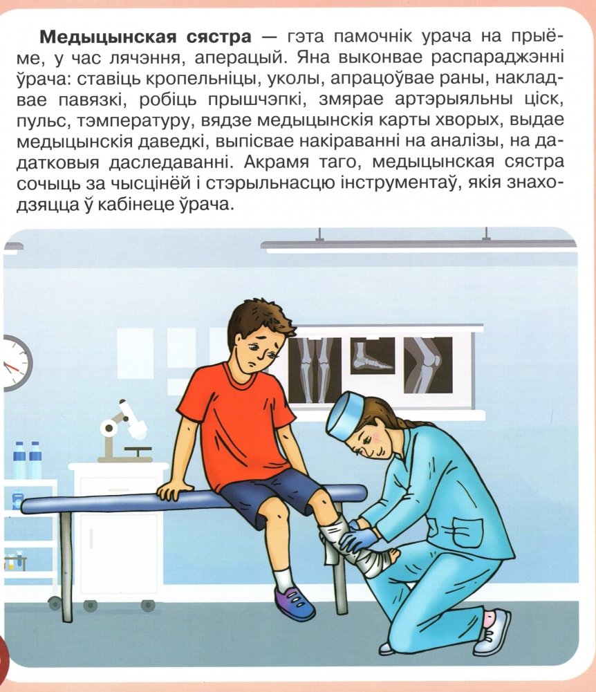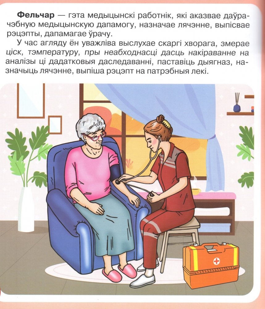Выданне дапаможа сфарміраваць у дзяцей уяўленні аб разнастайнасці медыцынскіх прафесій, будзе садзейнічаць выхаванню прафесійна значных якасцей асобы, выклікаць цікавасць да працы фельчара, медыцынскай сястры, фармацэўта. Ілюстрацыйны матэрыял, гульнявыя заданні дапамогуць замацаваць атрыманыя звесткі, стварыць станоўчы эмацыянальны водгук на змест кнігі.