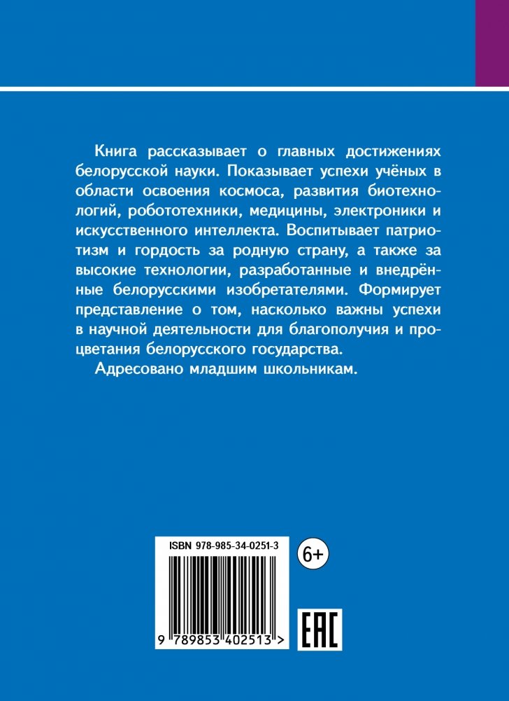 Книга рассказывает о главных достижениях белорусской науки. Показывает успехи учёных в области освоения космоса, развития биотехнологий, робототехники, медицины, электроники и искусственного интеллекта. Воспитывает патриотизм и гордость за родную страну, а также за высокие технологии, разработанные и внедрённые белорусскими изобретателями. Формирует представление о том, насколько важны успехи в научной деятельности для благополучия и процветания белорусского государства.