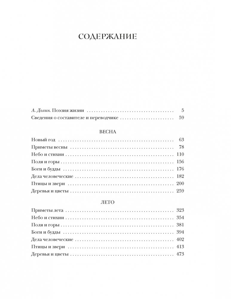 Утонченная и немногословная японская поэзия хайку всегда была отражением мира природы, воплощенного в бесконечной смене времен года. Человек, живущий обыденной жизнью, чьи пять чувств настроены на постоянное восприятие красоты земли и неба, цветов и трав, песен цикад и солнечного тепла, — вот лирический герой жанра, объединяющего поэзию, живопись и каллиграфию. Авторы хайку создали своего рода поэтический календарь, в котором отводилось место для разнообразных растений и животных, насекомых, птиц и рыб, для бытовых зарисовок и праздников. Настоящее уникальное издание предлагает читателю взглянуть на мир природы сквозь призму японских трехстиший в переводе профессора-востоковеда Александра Аркадьевича Долина. В оформлении использованы многочисленные гравюры и рисунки средневековых японских авторов, а также картины известного современного мастера японской живописи в стиле суми-э Олега Усова. Сборник дополнен каллиграфическими работами Станислава Усова.