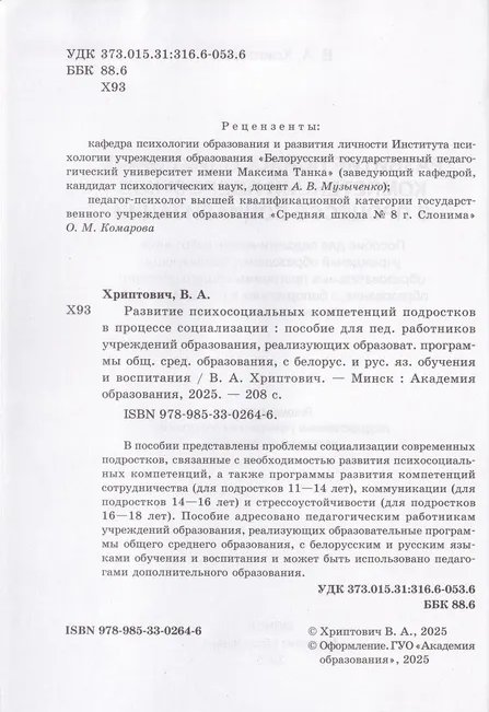 В пособии представлены проблемы социализации современных подростков, связанные с необходимостью развития психосоциальных компетенций, а также программы развития компетенций сотрудничества (для подростков 11-14 лет), коммуникации (для подростков 14—16 лет) и стрессоустойчивости (для подростков 16-18 лет). Пособие адресовано педагогическим работникам учреждений образования, реализующих образовательные программы общего среднего образования, с белорусским и русским языками обучения и воспитания и может быть использовано педагогами дополнительного образования.