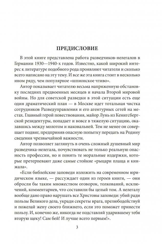 Главный герой повествования майор Лунь из Кенигсбергской резидентуры проходит через множество испытаний и не раз попадает в тяжелые ситуации. Как найти достойный выход из них, сохранив человеческое лицо и профессиональную честь?