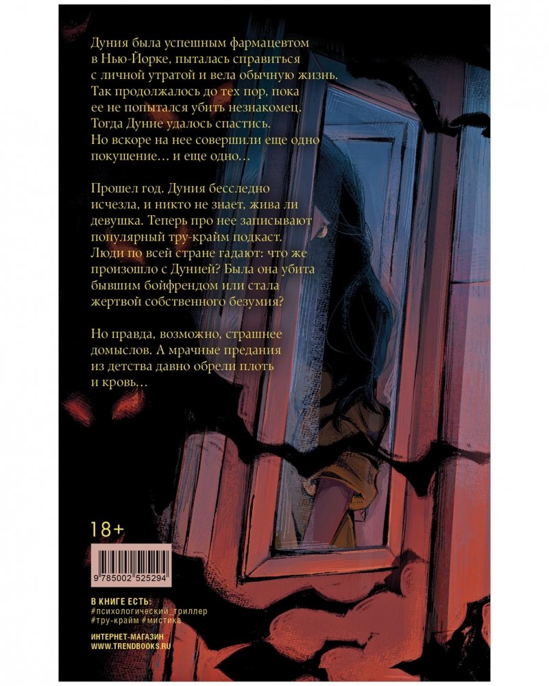 Прошел год. Дуния бесследно исчезла, и никто не знает, жива ли девушка. Теперь про нее записывают популярный тру-крайм подкаст. Люди по всей стране гадают: что же произошло с Дунией? Была она убита бывшим бойфрендом или стала жертвой собственного безумия? Но правда, возможно, страшнее домыслов. А мрачные предания из детства давно обрели плоть и кровь…