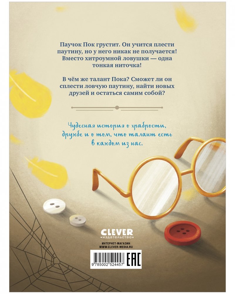 Маленький паучок Пок живет в антикварной лавке. Он учится плести паутину, но у него никак не получается. Вместо хитроумной ловушки — одна тонкая ниточка. Папа Пока расстраивается. Однажды Пок встречает своего сверстника паучка Спина, который зло подшучивает над его паутиной. Но все меняется. И оказывается, что у Пока есть настоящий талант! Сможет ли он сплести ловчую паутину, найти новых друзей и остаться самим собой?