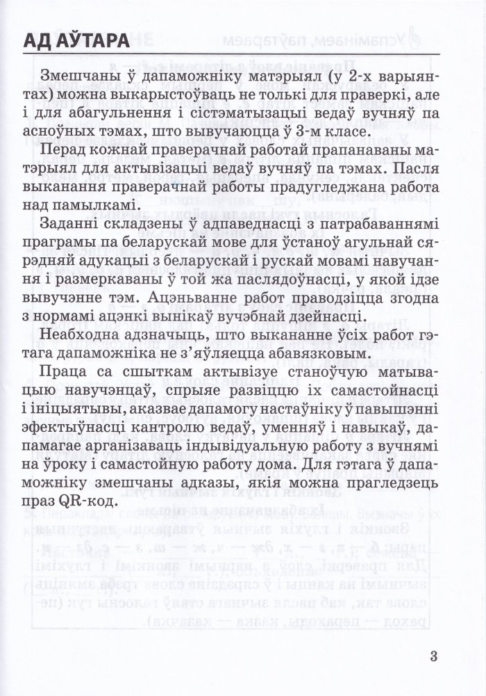 Матэрыял дапаможніка можна выкарыстоўваць не толькі для кантролю за вучэбнымі дасягненнямі вучняў, але і для абагульнення і сістэматызацыі іх ведаў па асноўных тэмах, што вывучаюцца ў 3-м класе. Праца са сшыткам дапамагае арганізаваць індывідуальную работу з вучнямі на ўроку і самастойную работу дома. Для гэтага ў дапаможніку змешчаны адказы, якія можна прагледзець праз QR-код.