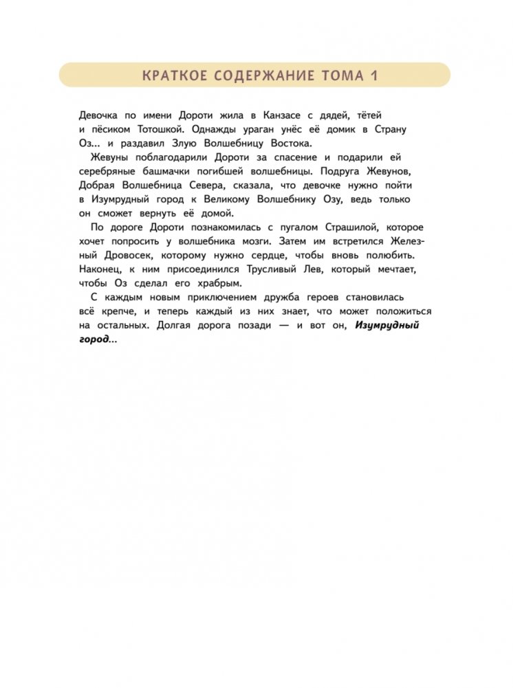 Знаменитая сказка Л. Фрэнка Баума о приключениях Дороти оживает на страницах этого потрясающего комикса. Юную Дороти, жившую на ферме со своими тётей и дядей, уносит ураган в загадочную и невероятную страну Оз. Чтобы вернуться домой, ей предстоит отправиться в полное опасностей и чудес путешествие по дороге из жёлтого кирпича.