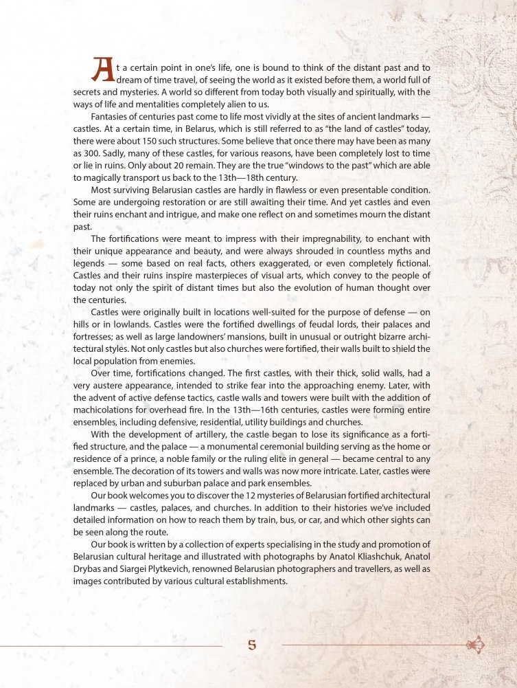 Багата ілюстраванае выданне расказвае пра 12 жамчужын беларускай абарончай архітэктуры: ад шырока вядомых рэстаўрыраваных Нясвіжскага і Мірскага замкаў да руін Быхаўскага і Смальянскага. Акрамя цікавых звестак пра гісторыю іх узнікнення, асаблівасці знешняга выгляду і найбольш папулярныя легенды, у кнізе даецца інфармацыя, як зручней дабірацца да прыведзеных архітэктурных аб’ектаў і якія яшчэ славутасці знаходзяцца побач.