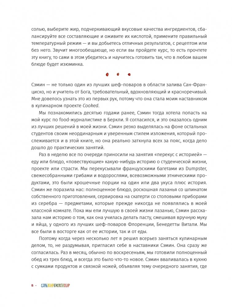 Соль оказывает комплексное воздействие на еду. Она имеет собственный вкус и усиливает вкус остальных ингредиентов. Соль уменьшает горечь, подчеркивает сладость и другие ароматы, в результате мы получаем от еды больше удовольствия. Даже если вы извлечете из этой книги всего один урок, пусть он будет таким: соль влияет на вкус блюд больше, чем любой другой ингредиент. Научитесь ее правильно использовать — и ваша еда всегда будет вкусной.