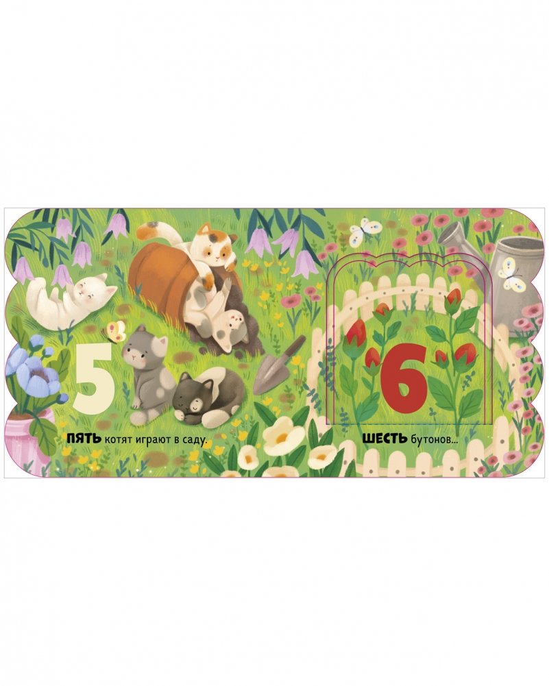 1 мишка, 2 птенца, 3 слоненка, 6 бутонов, 9 хомячков… «Первый счет» — чудесная первая книга малыша из прочного картона с пятью окошками для игры и развития мелкой моторики, книга для малышей, которая познакомит с животными и с цифрами до 10.