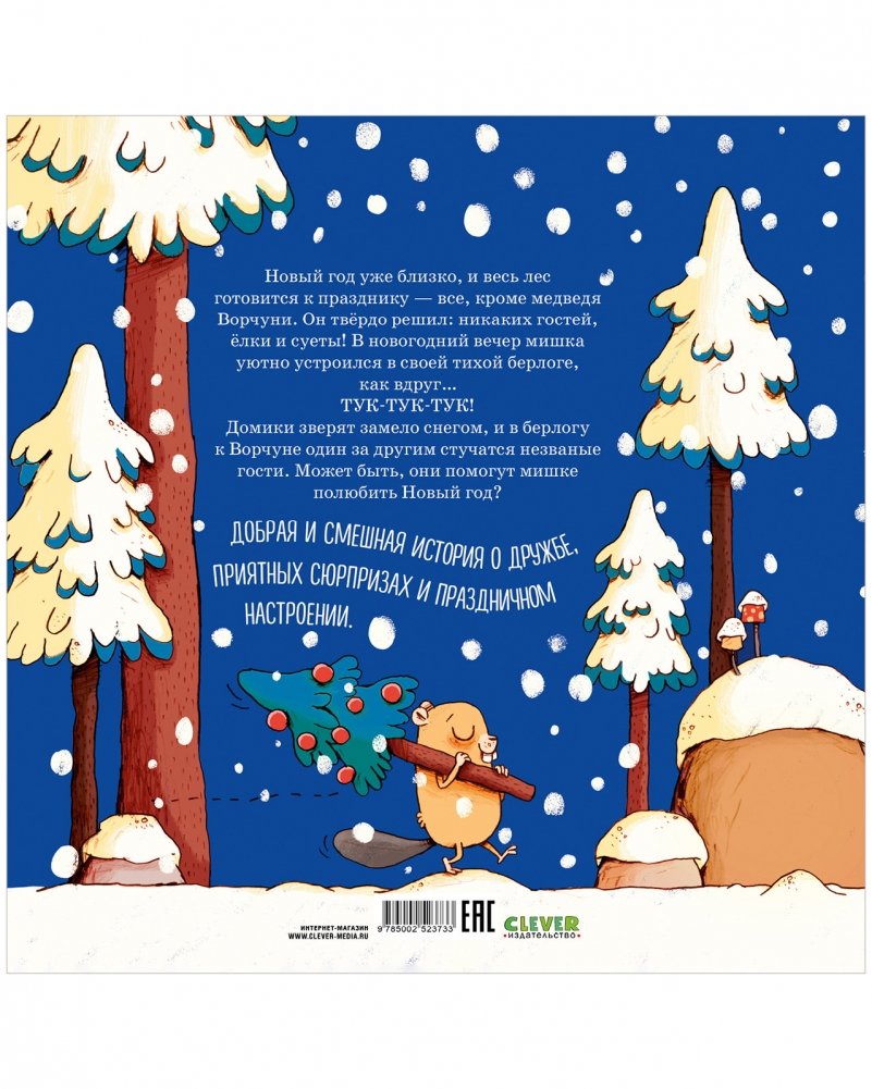 Новый год уже близко, и весь лес готовится к празднику — все, кроме медведя Ворчуни. Он твердо решил: никаких гостей, елки и суеты! В новогодний вечер мишка уютно устроился в своей тихой берлоге, как вдруг… ТУК-ТУК-ТУК!
