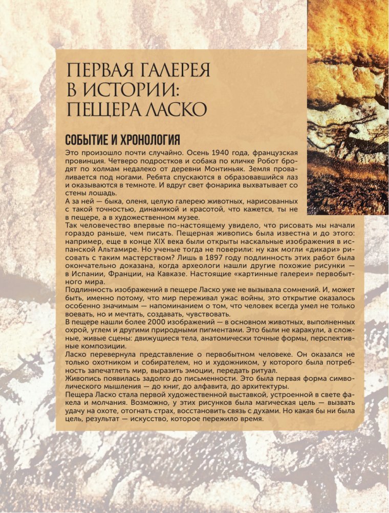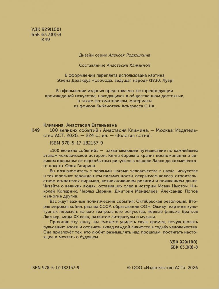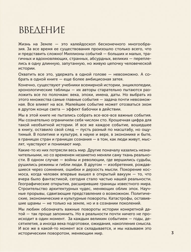 "100 великих событий" — захватывающее путешествие по важнейшим этапам человеческой истории. Книга бережно хранит воспоминания о великом прошлом: от первобытных рисунков в пещере Ласко до космического полета Юрия Гагарина.