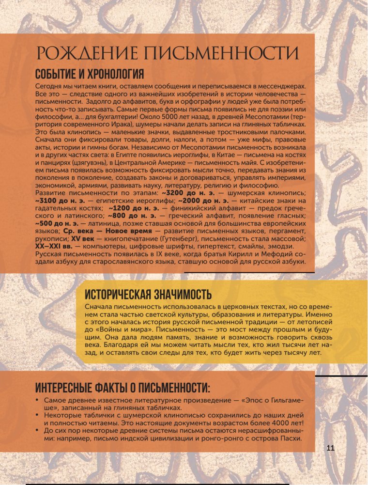 Вы познакомитесь с первыми шагами человечества в науке, искусстве и технологиях: зарождением письменности, открытием колеса, строительством египетских пирамид, возникновением религий и появлением денег. Читайте о великих людях, оставивших след в истории: Исаак Ньютон, Николай Коперник, Чарльз Дарвин, Дмитрий Менделеев, Александр Попов и многие другие.