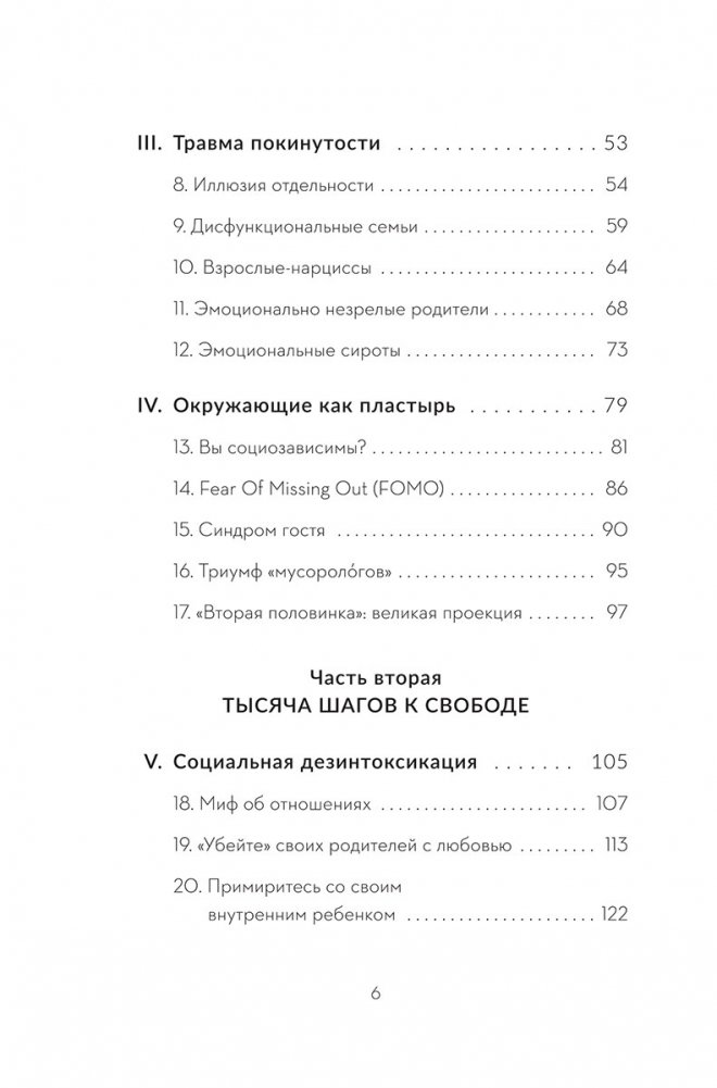 Эта книга — исцеляющее путешествие. Она задумана как руководство по социальной детоксикации, которое поможет читателю встретиться с его самым большим страхом — травмой покинутости — и содержит множество полезных советов, например предлагает перестать использовать других людей в качестве таблетки, чтобы заполнить свою экзистенциальную пустоту и заменить ими недостаток любви к себе. Нам нужно вернуться в собственное детство и примириться со своим внутренним ребенком. Только так мы сможем превратиться в того, кем нам суждено быть, — в нашего самого лучшего друга — и с удивлением обнаружить, что мы никогда не бываем совершенно одни.