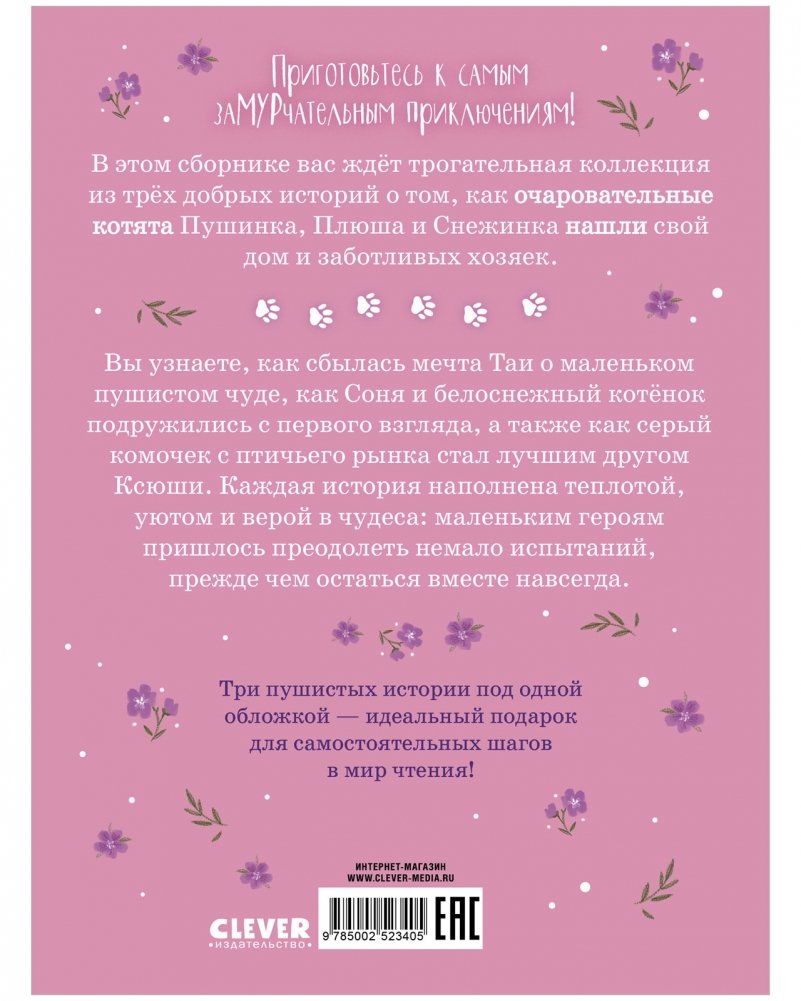 В сборнике «Мяу! Три истории про котят» вас ждет трогательная коллекция из трех добрых историй о том, как очаровательные котята Пушинка, Плюша и Снежинка нашли свой дом и заботливых хозяек. Из историй книги для детей вы узнаете, как сбылась мечта Таи о маленьком пушистом чуде, как Соня и белоснежный котенок подружились с первого взгляда, а также как серый комочек с птичьего рынка стал лучшим другом Ксюши.