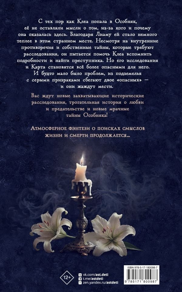 С тех пор как Клеа попала в Особняк, её не оставляли мысли о том, из-за кого и почему она оказалась здесь. Благодаря Лиаму ей стало немного теплее в этом странном месте. Несмотря на внутренние противоречия и собственные тайны, которые требуют расследования, он пытается помочь Клеа вспомнить подробности и найти преступника. Но его исследования и Карта становятся всё более опасными для него. И будто мало было проблем, из подземелья с серыми призраками сбегают двое "опасных" — и они жаждут мести.