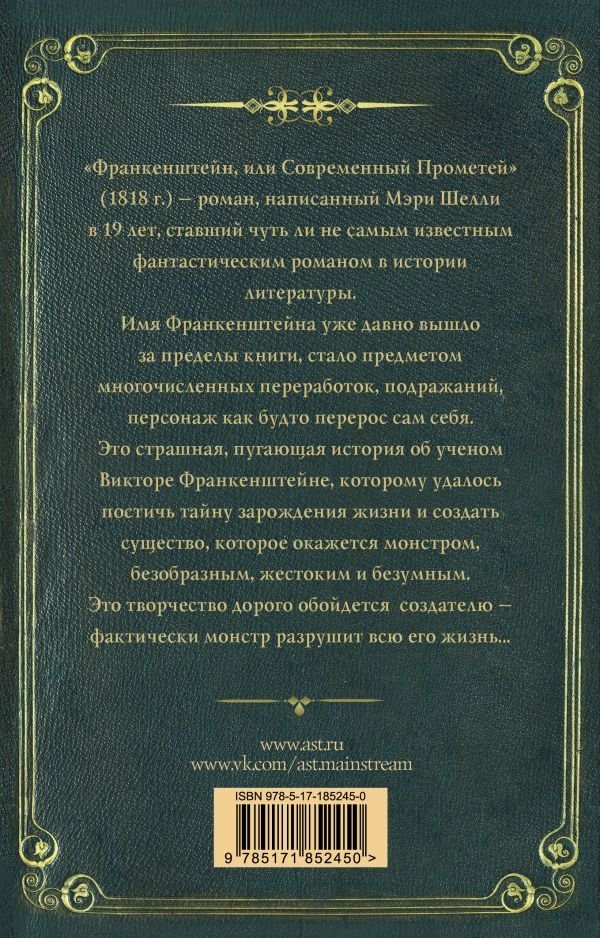 Имя Франкенштейна уже давно вышло за пределы книги, стало предметом многочисленных переработок, подражаний, персонаж как будто перерос сам себя. Это страшная, пугающая история об ученом Викторе Франкенштейне, которому удалось постичь тайну зарождения жизни и создать существо, которое окажется монстром, безобразным, жестоким и безумным. Это творчество дорого обойдется создателю — фактически монстр разрушит всю его жизнь...
