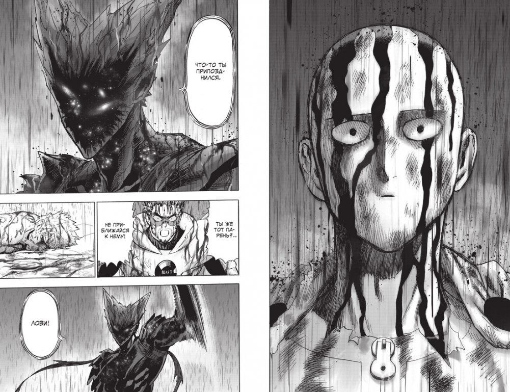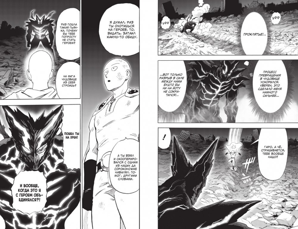 Сайтама и Гаро наконец сходятся в поединке. Сайтама уговаривает соперника прислушаться к чувствам мальчика Тарэо, но Гаро игнорирует Лысого Плаща и стремится как можно скорее стать чудовищем. Вот только охотнику на героев так и не удается превзойти Сайтаму. И когда Гаро уже готов принять поражение, откуда-то извне раздается голос — и бывший ученик Бэнга нежданно-негаданно обретает запредельную силу!
