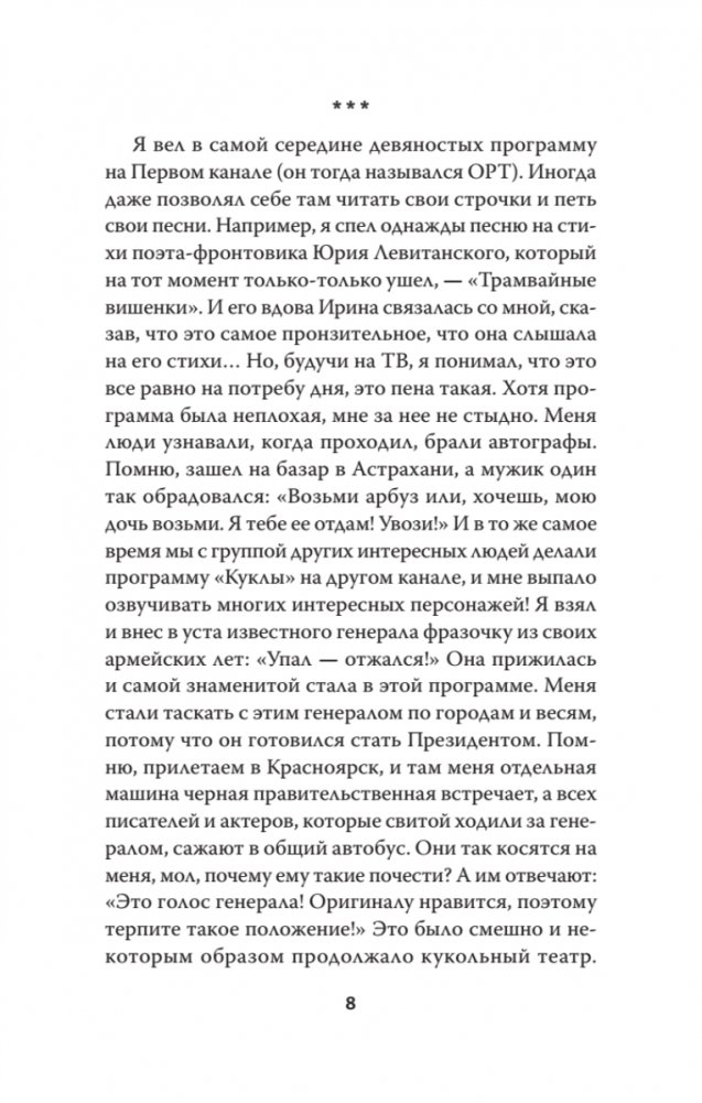 Автобиографичность служит здесь художественной формой: за личными воспоминаниями разворачивается широкий калейдоскоп эпох, событий и образов. Автор переносит читателя то в атмосферу Театра на Таганке, то к демонстрации военной техники, то к истории создания знаменитого «Ржева». В основе структуры — жанр байки, объединяющей разрозненные сюжеты фигурой рассказчика, который одновременно близок автору и ускользает от прямого отождествления с ним.