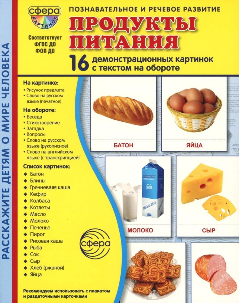 Демонстрационные картинки. Продукты питания: 16 демонстрационных картинок с текстом