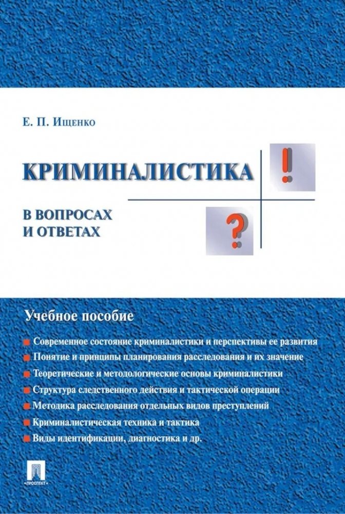 Учебное пособие «Криминалистика в вопросах и ответах» подготовлено с учетом норм Уголовно-процессуального кодекса Российской Федерации. Автор придерживался традиционной структуры данной учебной дисциплины, отвечающей требованиям государственного стандарта высшего юридического образования. Структура изложения позволит быстро освоить материал, подготовиться к зачету или экзамену.