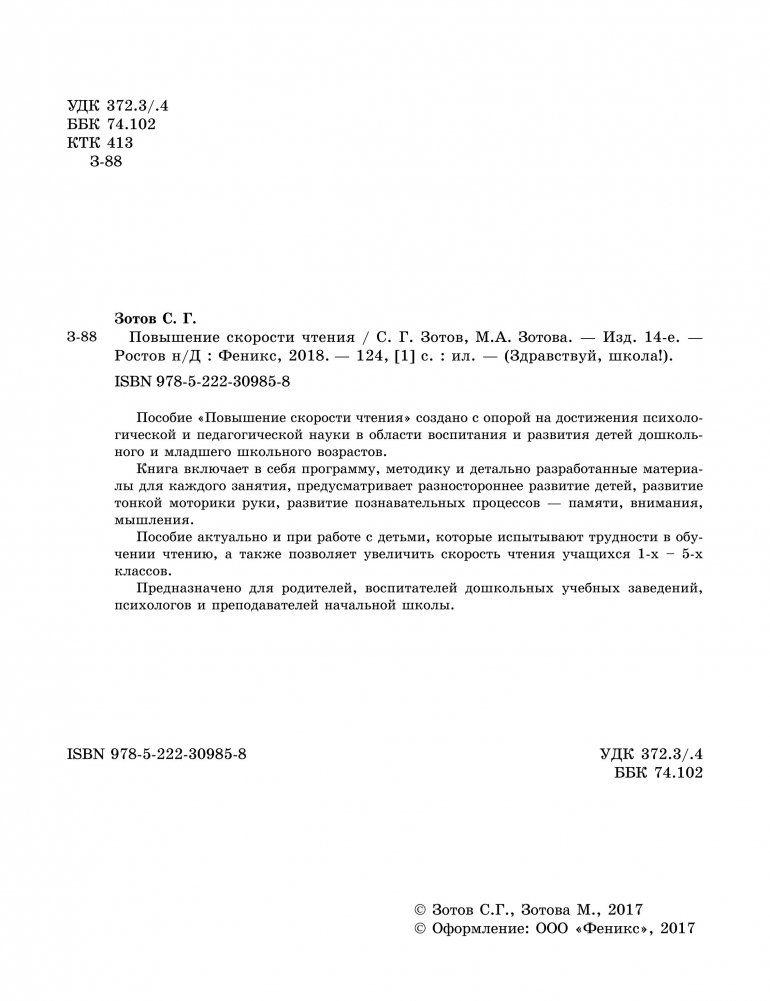 Пособие "Повышение скорости чтения" создано с опорой на достижения психологической и педагогической науки в области воспитания и развития детей дошкольного и младшего школьного возрастов. Книга включает в себя программу, методику и детально разработанные материалы для каждого занятия, предусматривает разностороннее развитие детей, развитие тонкой моторики руки, развитие познавательных процессов - памяти, внимания, мышления. Пособие актуально и при работе с детьми, которые испытывают трудности в обучении чтению, а также позволяет увеличить скорость чтения учащихся 1-х - 5-х классов. Предназначено для родителей, воспитателей дошкольных учебных заведений, психологов и преподавателей начальной школы.