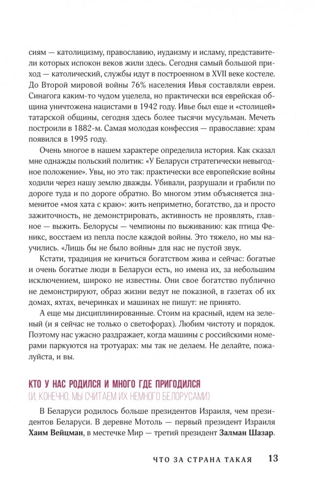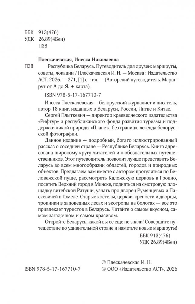 Представьте: вы листаете страницы, а перед глазами оживают пейзажи Беларуси. Вот туман стелется над Беловежской пущей, вот солнечные блики играют на стенах Каложской церкви в Гродно, а вот вы уже поднимаетесь на смотровую площадку витебской Ратуши… Все это возможно благодаря уникальному союзу таланта: Инессы Плескачевской — журналиста и писателя с 18 опубликованными книгами (Беларусь, Россия, Литва, Китай); Сергея Плыткевича — директора краеведческого издательства "Рифтур" и республиканского фонда развития туризма и поддержки дикой природы ≪Планета без границ≫, легенда белорусской фотографии. Что внутри: подробный рассказ о регионах, городах и природных достопримечательностях Беларуси; эксклюзивные фотографии, передающие атмосферу страны; маршруты по знаковым местам: от Беловежской пущи до дворца Румянцевых и Паскевичей в Гомеле; истории о костелах, церквях крепостях, дворцах и заповедных тропах. Книга подойдет: путешественникам, планирующим поездку в Беларусь; тем, кто хочет лучше узнать родную страну; ценителям качественной краеведческой литературы; отличный подарок для друзей и коллег. Откройте Беларусь с нового ракурса!