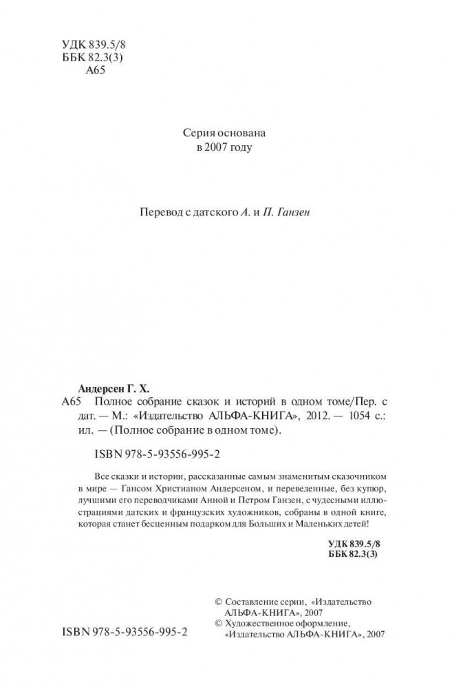 Все сказки и истории, рассказанные самым знаменитым сказочником в мире - Гансом Христианом Андерсеном, и переведенные, без купюр, лучшими его переводчиками Анной и Петром Ганзеном, с чудесными иллюстрациями датских художников Вильхельма Педерсена и Лоренца Фрюлиха - собраны в одном книге, которая станет бесценным подарком для Больших и Маленьких детей!