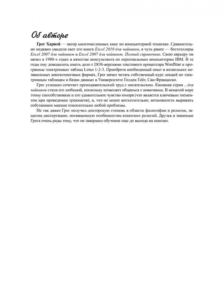 В этой книге вы найдете ответы на все вопросы, возникающие при работе с Excel! Вы ведь не планируете посвятить всю жизнь изучению Excel? Вам нужно лишь разобраться с основами и начать создавать электронные таблицы. Прочитайте полностью обновленное руководство по Excel 2013, и вы научитесь применять эту программу для решения большинства вычислительных задач. Создавайте, редактируйте и печатайте рабочие листы, выбирайте различные представления данных и выполняйте множество других операций с электронными таблицами. • Освойте экран Excel. Познакомьтесь с лентой, панелью быстрого доступа, строкой формул и другими компонентами экрана Excel. • Изучите формулы и функции. Узнайте, что собой представляют формулы и функции и как с ними работать. • Соблюдайте правила редактирования ячеек. Ознакомьтесь с различными способами выделения и форматирования ячеек, а также с числовыми форматами и настройками шрифтов. • Листы и книги. Узнайте, чем отличаются листы от книг, и научитесь упорядочивать данные на них. • Управляйте файлами. Научитесь сохранять и восстанавливать данные. • Обработка данных. Создавайте таблицы данных и сценарии, позволяющие выполнять анализ "что, если". • Графическая интерпретация данных. Превратите таблицы данных в удобные и наглядные диаграммы.