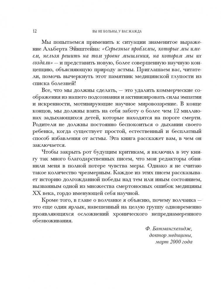 Эта книга рассказывает об открытии в медицине: оказывается, причиной многих наших болезней и расстройств является обычное обезвоживание. Исходя из главенствующей роли воды в организме, доктор Батмангхелидж подробно объясняет читателям, каким образом ее недостаток влияет на развитие многих заболеваний и как можно этого избежать.