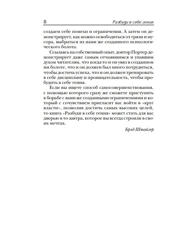 Доктор Портер утверждает, что в каждом человеке живет гений. Однако одни гении действуют и проявляют себя более эффективно и успешно, чем другие. Этот секрет П. Портер раскрывает в своей книге, используя для этого увлекательные упражнения, занимательные истории, тесты и направляющие диалоги. Он показывает читателю, разрушить преграды, собственноручно воздвигнутые на своем пути, выработать в себе позитивное отношение к жизни, стать более гибким и энергичным, научиться концентрироваться на достижении поставленных целей.