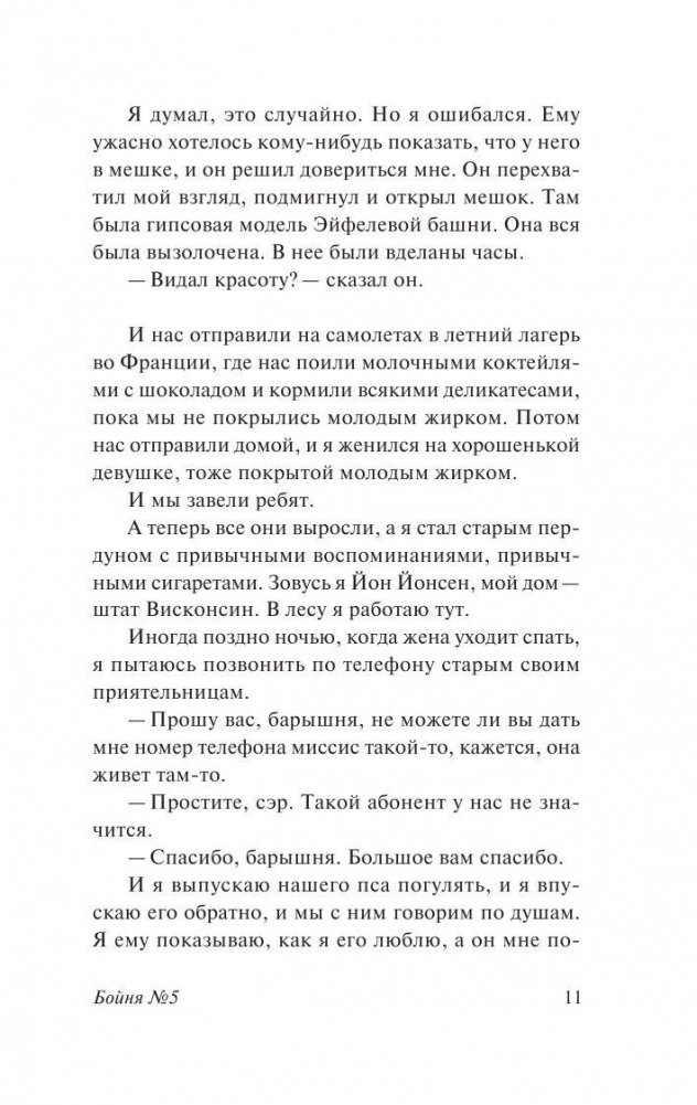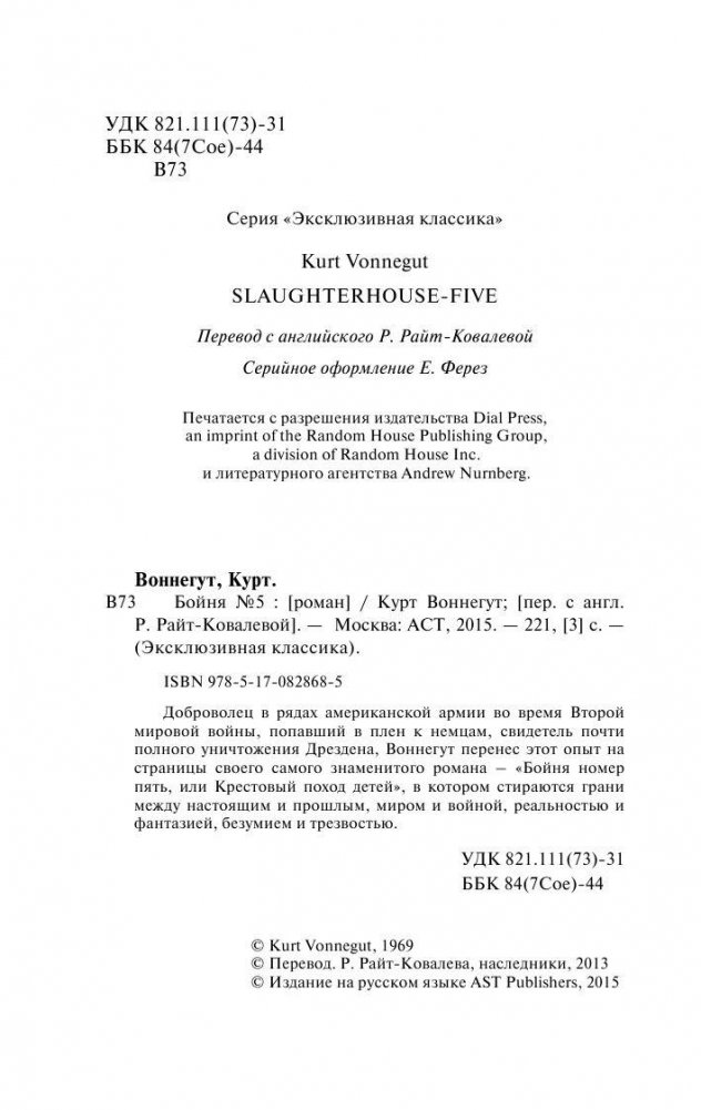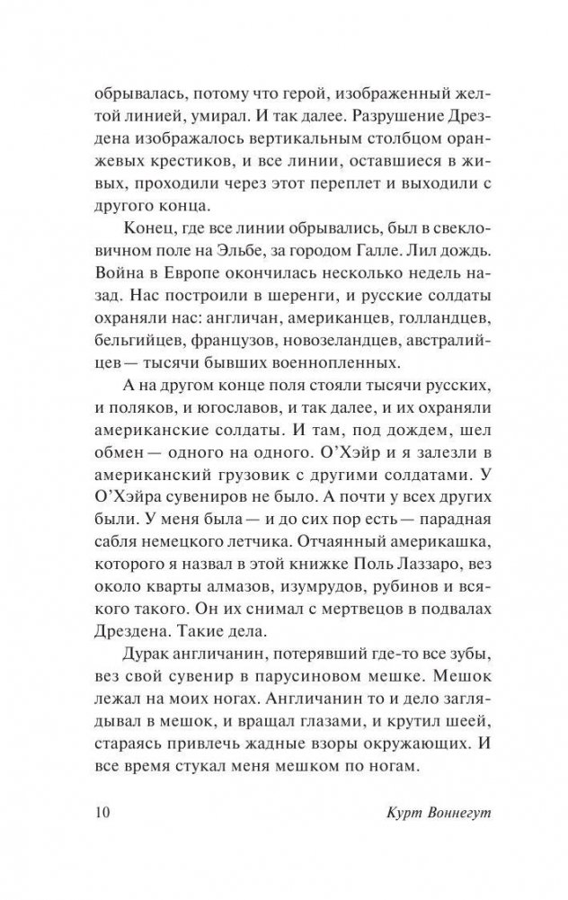 Доброволец в рядах американской армии во время Второй мировой войны, попавший в плен к немцам, свидетель почти полного уничтожения Дрездена, Воннегут перенес этот опыт на страницы своего самого знаменитого романа – «Бойня номер пять, или Крестовый поход детей», в котором стираются грани между настоящим и прошлым, миром и войной, реальностью и фантазией, безумием и трезвостью.