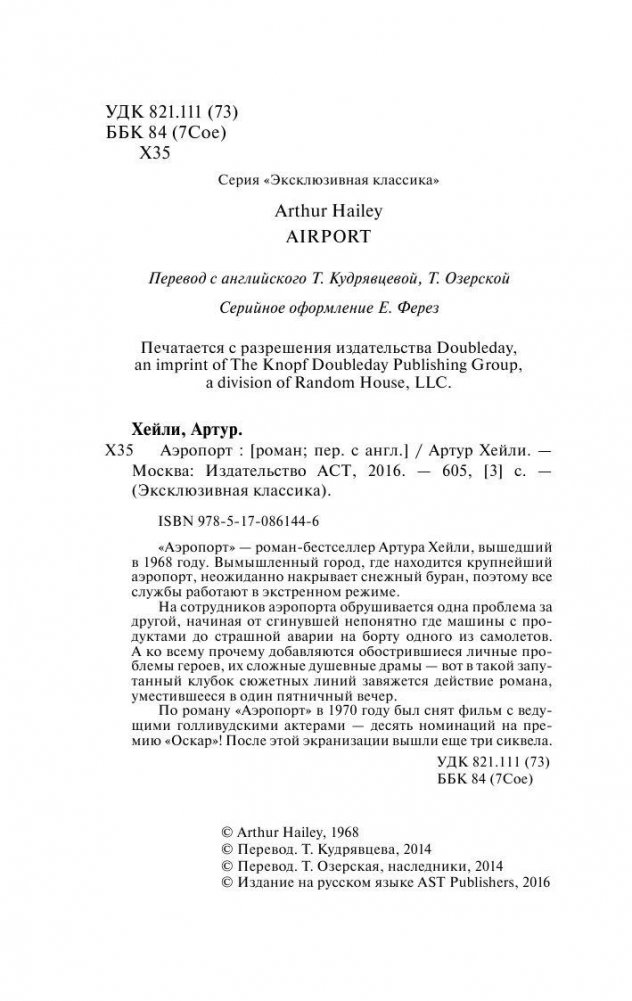 "Аэропорт" – роман-бестселлер Артура Хейли, вышедший в 1968 году. Вымышленный город, где находится крупнейший аэропорт, неожиданно накрывает снежный буран, поэтому все службы работают в экстренном режиме. На сотрудников аэропорта обрушивается одна проблема за другой, начиная от сгинувшей непонятно где машины с продуктами до страшной аварии на борту одного из самолетов. А ко всему прочему добавляются обострившиеся личные проблемы героев, их сложные душевные драмы – вот в такой запутанный клубок сюжетных линий завяжется действие романа, уместившееся в один пятничный вечер. По роману "Аэропорт" в 1970 году был снят фильм с ведущими голливудскими актерами – десять номинаций на премию "Оскар"! После этой экранизации вышли еще три сиквела.