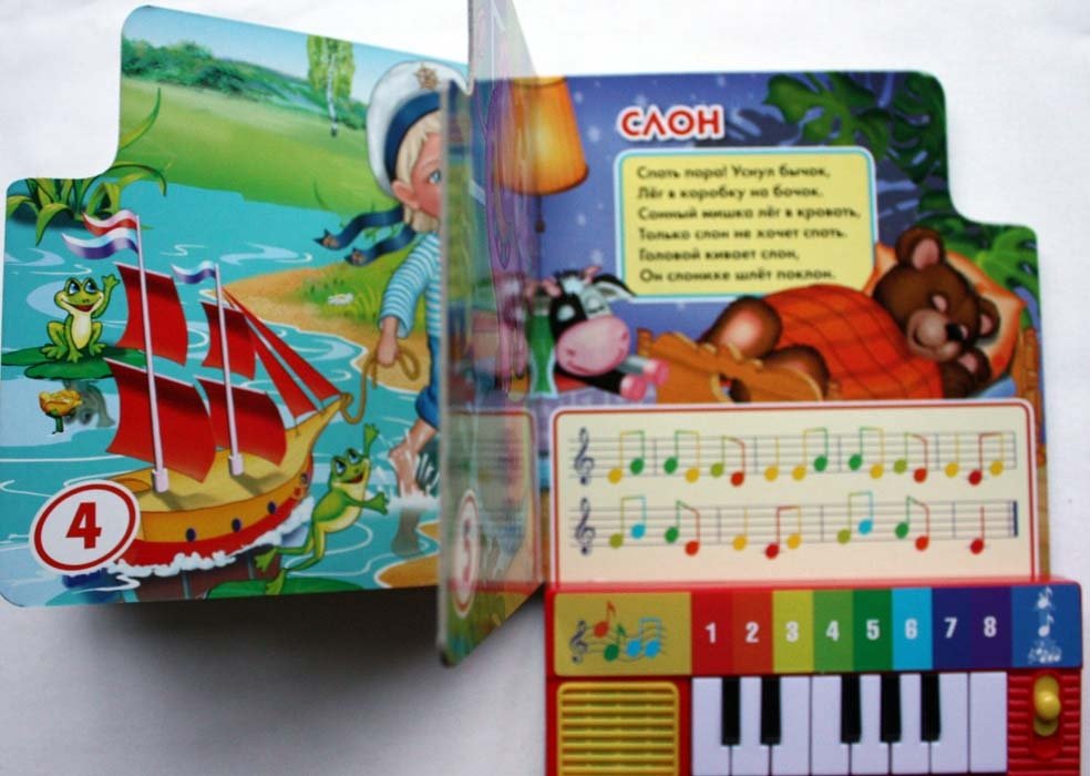 Книга-пианино с 8 клавишами и песенками. Формат: 143х202 мм. Объем: 10 стр.