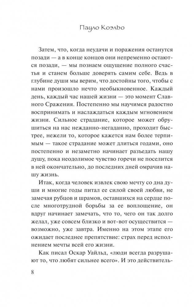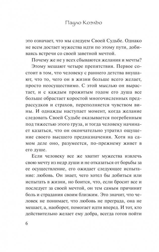 "Алхимик" — самый известный роман бразильского писателя Пауло Коэльо, любимая книга миллионов людей во всем мире. В юности люди не боятся мечтать, все кажется им возможным. Но проходит время, и таинственная сила принимается им внушать, что их желания неосуществимы. "Добиться воплощения Своей Судьбы — вот единственная подлинная обязанность человека..." — утверждает Пауло Коэльо. Этот, ставший культовым, роман-притча способен изменить жизнь своих читателей.