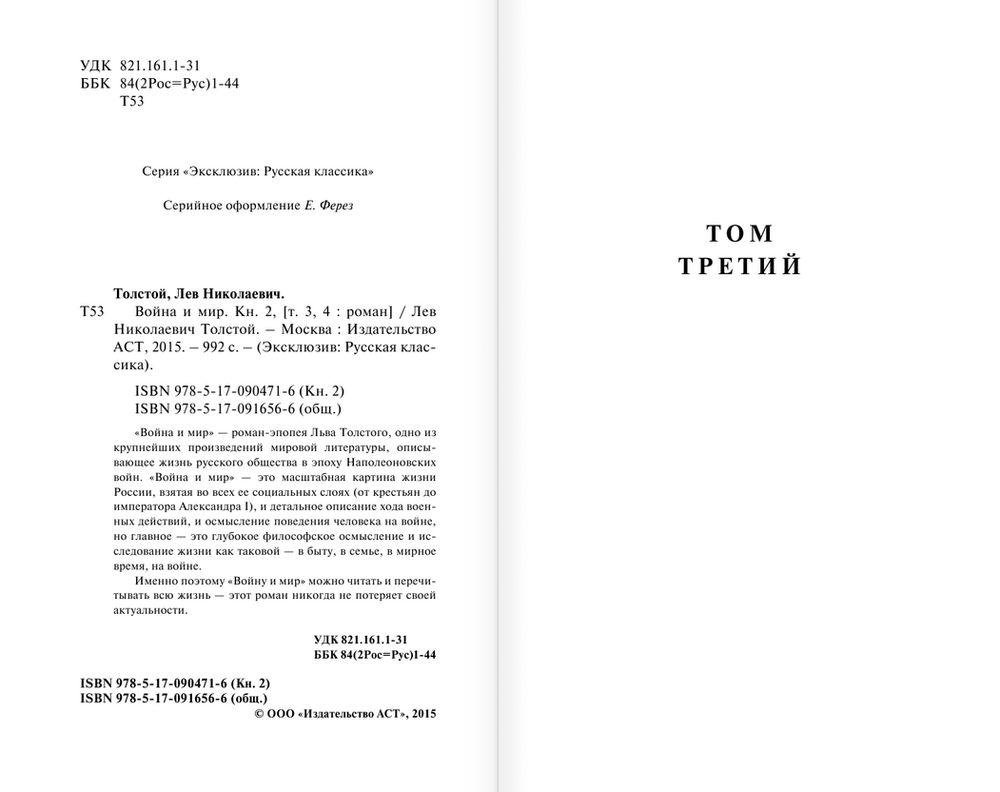 "Война и мир" — роман-эпопея Льва Толстого, одно из крупнейших произведений мировой литературы, описывающее жизнь русского общества в эпоху Наполеоновских войн. "Война и мир" — это масштабная картина жизни России, взятая во всех ее социальных слоях (от крестьян до императора Александра I), и детальное описание хода военных действий, и осмысление поведения человека на войне, но главное — это глубокое философское осмысление и исследование жизни как таковой — в быту, в семье, в мирное время, на войне. Именно поэтому "Войну и мир" можно читать и перечитывать всю жизнь — этот роман никогда не потеряет своей актуальности.