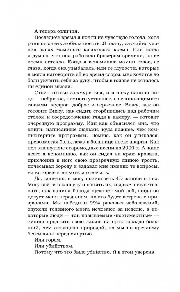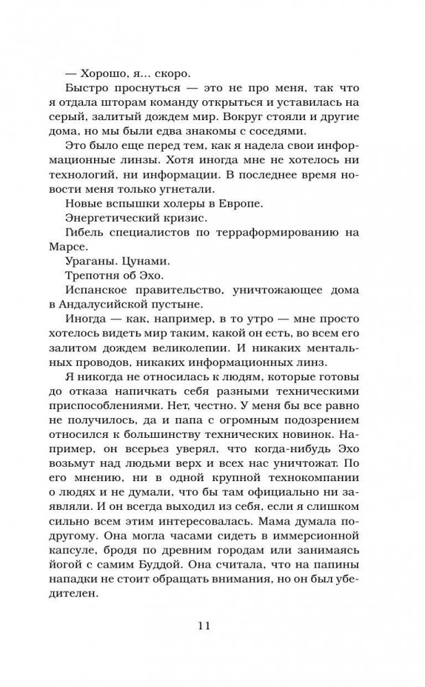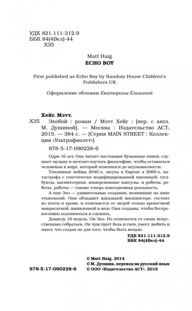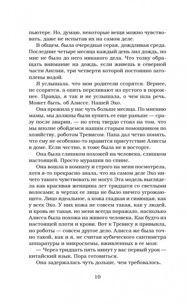 Одри 16 лет. Она читает настоящие бумажные книги, слушает музыку и мечтает оставаться человеком в мире, который изменился до неузнаваемости. Топливные войны 2040-х, засуха в Европе в 2060-х, катастрофа с генетически модифицированной пшеницей, гугл-бунты, магнитотреки, иммерсионные капсулы, и роботы, роботы, роботы — такова теперь повседневная реальность. А еще Эхо — удивительные создания, возникшие на пике технологий. Они обладают идеальной внешностью, состоят из плоти и крови, и отличаются от людей только крошечной микросхемой, вживленной в мозг. Они созданы, чтобы беспрекословно подчиняться и служить. Дэниелу 16 недель. Он Эхо. Но отличается от своих искусственных собратьев. Он чувствует боль и гнев, умеет любить и знает, что создан не для того, чтобы быть вещью.