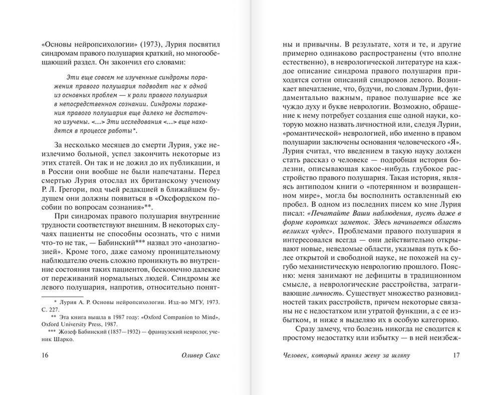 Книга американского невролога и нейропсихолога Оливера Сакса описывает клинические истории его пациентов, пытающихся справиться с серьезными и необычными психическими расстройствами, а также мистические видения прошлого, трактуемые наукой как проявления неврозов. Книга написана легким языком, и подойдет как для специалистов в психиатрии, так и для обычных читателей.