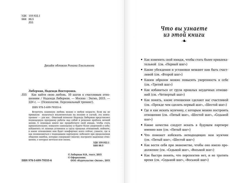 О чем эта книга: Встретить взаимную любовь можно в любом возрасте. Если вы не привыкли полагаться исключительно на везение и случай, эта книга-тренинг – для вас. Опытный психолог представляет полноценную программу работы над собой и решения проблем личной жизни. С помощью книги вы: - проработаете свой имидж, чтобы стать привлекательнее; - повысите самооценку и будете более уверенной в себе; - избавитесь от ложных установок и груза прошлых отношений; - поймете, в каких отношениях вам будет комфортнее всего сейчас; - узнаете, где и как познакомиться с подходящим партнером; - избежите при продолжении общения ошибок, которые совершают многие; - построите надежные отношения, о которых мечтали всю жизнь. Для кого эта книга: Для женщин, преимущественно от 30 лет. Кто автор: Надежда Либерман — психолог-консультант с двумя высшими психологическими образованиями и большим опытом работы в России и Германии. Занимаясь с 2006 года частной практикой, помогает людям решать их проблемы в личной и семейной жизни. Живет и работает в г. Дюссельдорфе. Особенности книги: - Книга-тренинг для тех, у кого нет возможности посещать «живые» тренинги. - Автор – опытный практикующий психолог. - Множество тестов и упражнений, которые помогут лучше понять себя и решить личные проблемы. - Эффективные советы и рекомендации для женщин разного возраста, с учетом их желаний и потребностей. Отзывы: "Если женщине исполнилось 30 лет, или 40, или 50, или 60, а она одинока, поиск «подходящего» мужчины может представлять определенную трудность. Это, увы, факт. Занимательные психологические тесты и пошаговые инструкции этой книги если и не сработают напрямую, то помогут разобраться в своих отношениях с противоположным полом". Наталья Горбунова, ведущий редактор журнала "Лиза". "Очень важно, что книга не написана в ключе «для всех, кому за 30». Ведь потребности и стремления у женщин 30, 40, 50 лет могут заметно различаться. Все рекомендации даны для конкретной возрастной категории". Ольга Маховская, психолог, писатель.