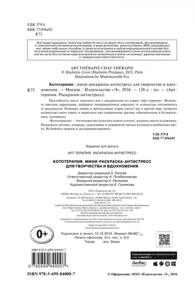 Расслабьтесь после тяжелого дня с раскрасками из серии «Арт-терапия». Возьмите цветные карандаши, выберите понравившуюся картинку и полностью отключитесь от реальности. Плавные линии и причудливые узоры унесут вас в другой мир, позволят полностью снять стресс и вернуться уже совершенно другим, обновленным и безмятежным, человеком. "Кототерапия" – это множество чудесных кошек и котят, ждущих своего художника. Раскрасьте уютных, озорных, задумчивых и невероятно милых котиков в необычные цвета. Не бойтесь творить и экспериментировать!
