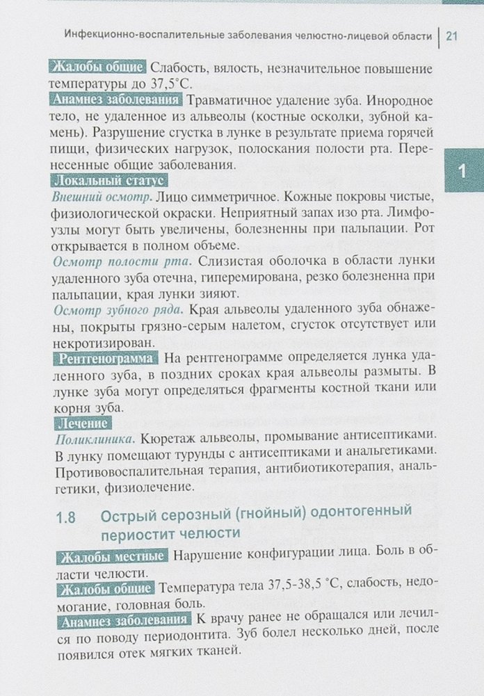 Справочник содержит основные современные сведения по хирургической стоматологии и челюстно-лицевой хирургии. Описаны основные заболевания, наиболее часто встречающиеся на приеме у стоматолога-хирурга и челюстно-лицевого хирурга. Краткость и последовательность изложения материала позволит систематизировать знания студентам и начинающим врачам-стоматологам. Акцент сделан на клинической картине заболеваний, ее грамотном описании в медицинских документах. Кроме этого приведены данные о рентгенологической картине и о методах лечения, которые могут быть использованы в поликлинике и стационаре. Для студентов стоматологических и лечебных факультетов медицинских вузов, магистрантов, врачей-интернов, врачей-стоматологов, хирургов-стоматологов, челюстно-лицевых хирургов, врачей смежных специальностей (хирургов, оториноларингологов, офтальмологов, нейрохирургов и др.).