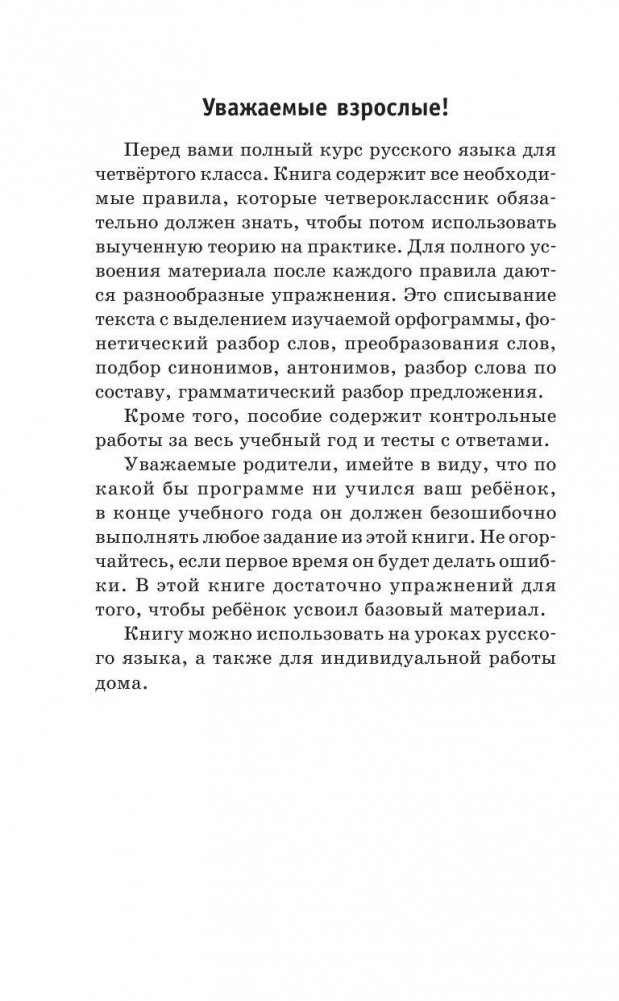 Полный курс русского языка для 4 класса содержит все необходимые правила, которые четвероклассник обязательно должен знать, чтобы потом использовать выученную теорию на практике. С помощью разнообразных упражнений, а также контрольных и тестовых заданий ученики лучше осваивают изучаемую тему, тренируют память, повышают орфографическую зоркость и культуру письменной речи. Книгу можно использовать на уроках русского языка, а также для индивидуальной работы дома.