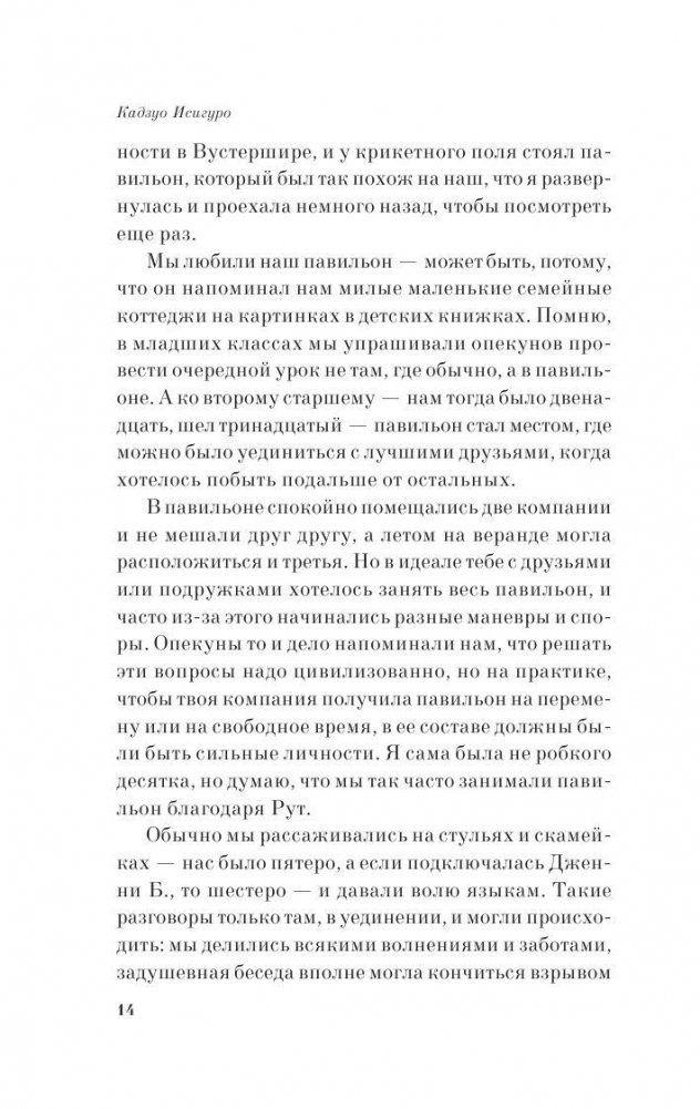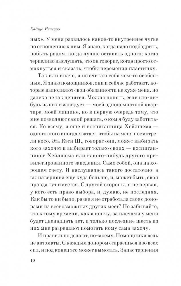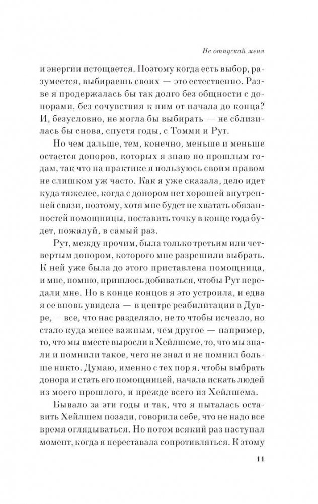 "Не отпускай меня" - пронзительная книга, которая по праву входит в список 100 лучших английских романов всех времен по версии журнала "Time". Ее автор урожденный японец, выпускник литературного семинара Малькольма Брэдбери и лауреат Букеровской премии (за роман "Остаток дня"). Тридцатилетняя Кэти вспоминает свое детство в привилегированной школе Хейлшем, полное странных недомолвок, половинчатых откровений и подспудной угрозы. Это роман-притча. Это история любви, дружбы и памяти. Это предельное овеществление метафоры "служить всей жизнью".