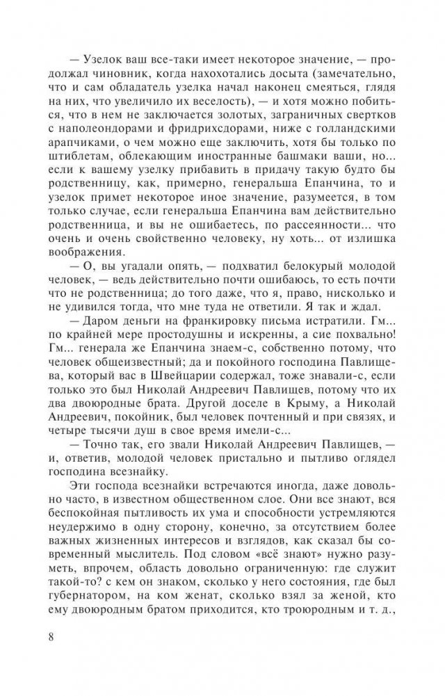 «Идиот». Роман, в котором творческие принципы Достоевского воплощаются в полной мере, а удивительное владение сюжетом достигает подлинного расцвета. Яркая и почти болезненно талантливая история несчастного князя Мышкина, неистового Парфена Рогожина и отчаявшейся Настасьи Филипповны, много раз экранизированная и поставленная на сцене, и сейчас завораживает читателя…