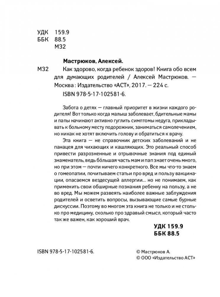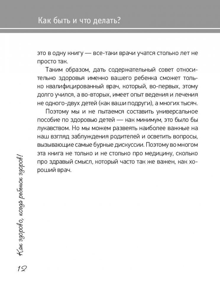 Забота о детях – главный приоритет в жизни каждого родителя! Вот только когда малыш заболевает, бдительные мамы и папы начинают активно гуглить симптомы недуга, прикладывать к больному месту подорожник, заниматься самолечением, но никак не хотят включить голову и обратиться к врачу. Эта книга – не справочник детских заболеваний и не панацея для чихающих и кашляющих. Это реальный способ привести разрозненные и отрывочные знания под единый знаменатель, ведь большая часть мам и пап знает очень много, но при этом – почти ничего конкретного. Все мы что-то знаем о гомеопатии, почитываем статьи про вред и пользу вакцинации, опасаемся вездесущей аллергии, но не понимаем, как применить свои обширные познания ребенку на пользу, а не во вред. Мы можем развеять наиболее важные заблуждения родителей и осветить вопросы, вызывающие самые бурные дискуссии. Поэтому во многом эта книга не только и не столько про медицину, сколько про здравый смысл, который часто так же важен, как хороший врач.