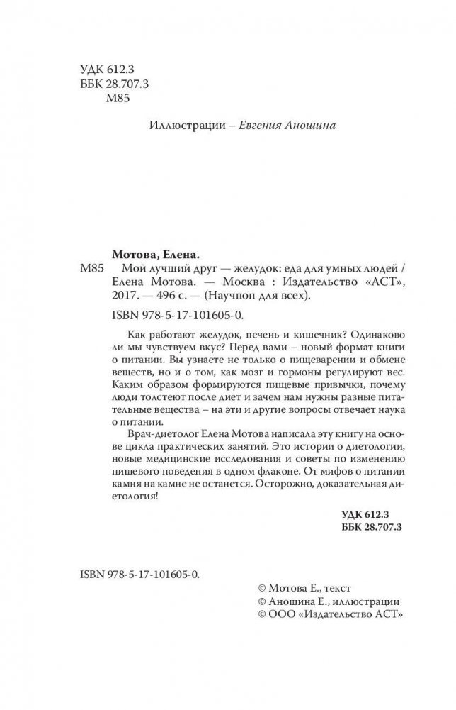 Елена Мотова – врач-диетолог и научный журналист. Постоянно учится, любимый из пройденных курсов – Nutrition for Health Promotion в Калифорнийском университете (UCSF). Ведет нескучный блог о доказательной диетологии. Читает лекции о питании и пищевом поведении. Хорошо готовит и с удовольствием ест. Как работают желудок, печень и кишечник? Одинаково ли мы чувствуем вкус? Перед вами – новый формат книги о питании. Вы узнаете не только о пищеварении и обмене веществ, но и о том, как мозг и гормоны регулируют вес. Каким образом формируются пищевые привычки, почему люди толстеют после диет и зачем нам нужны разные питательные вещества – на эти и другие вопросы отвечает наука о питании. Врач-диетолог Елена Мотова написала эту книгу на основе цикла практических занятий. Это истории о диетологии, новые медицинские исследования и советы по изменению пищевого поведения в одном флаконе. От мифов о питании камня на камне не останется. Осторожно, доказательная диетология!